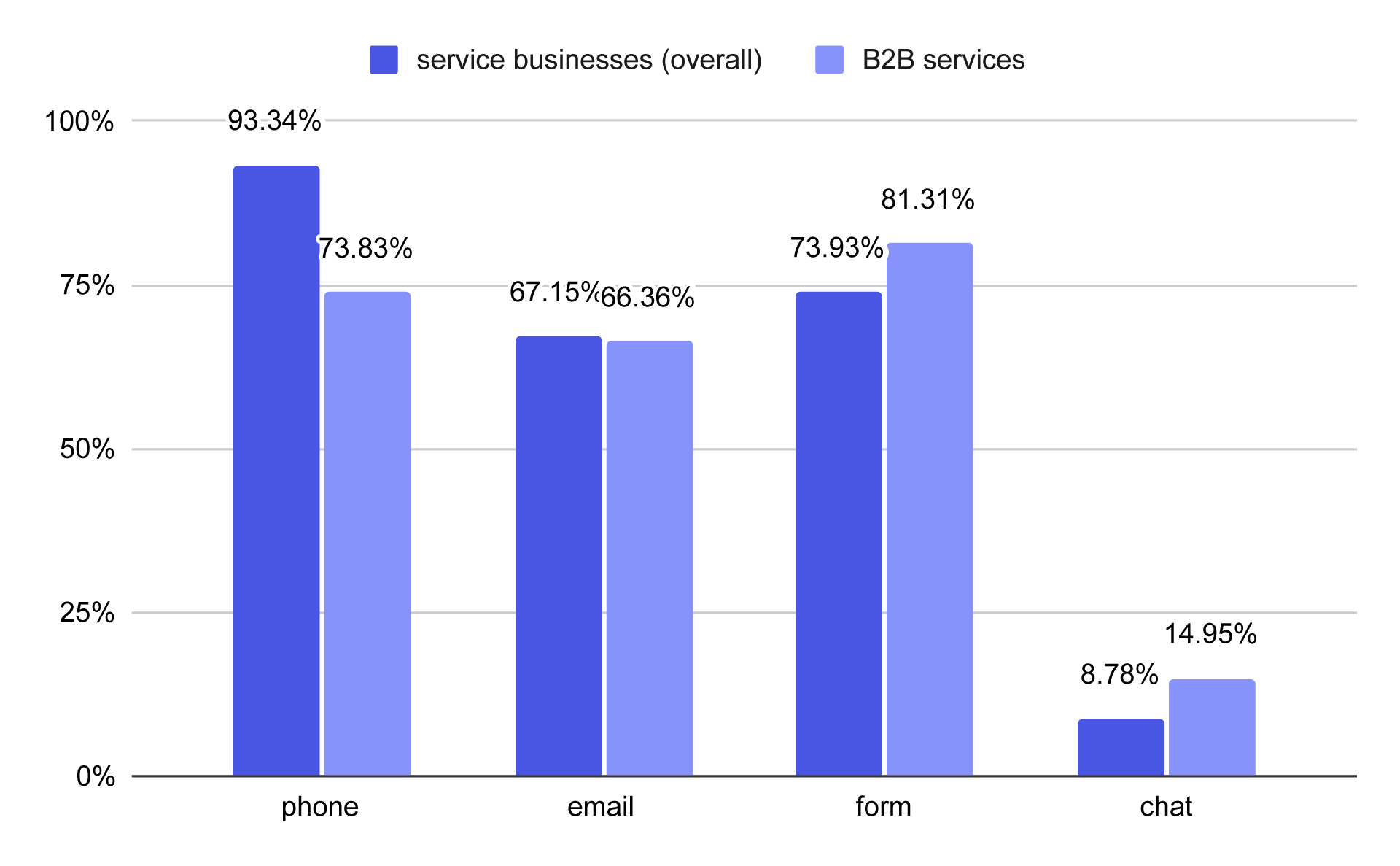 Percentage of B2B and service businesses overall displaying contact methods on their website: phone, email, contact form, chat widget
