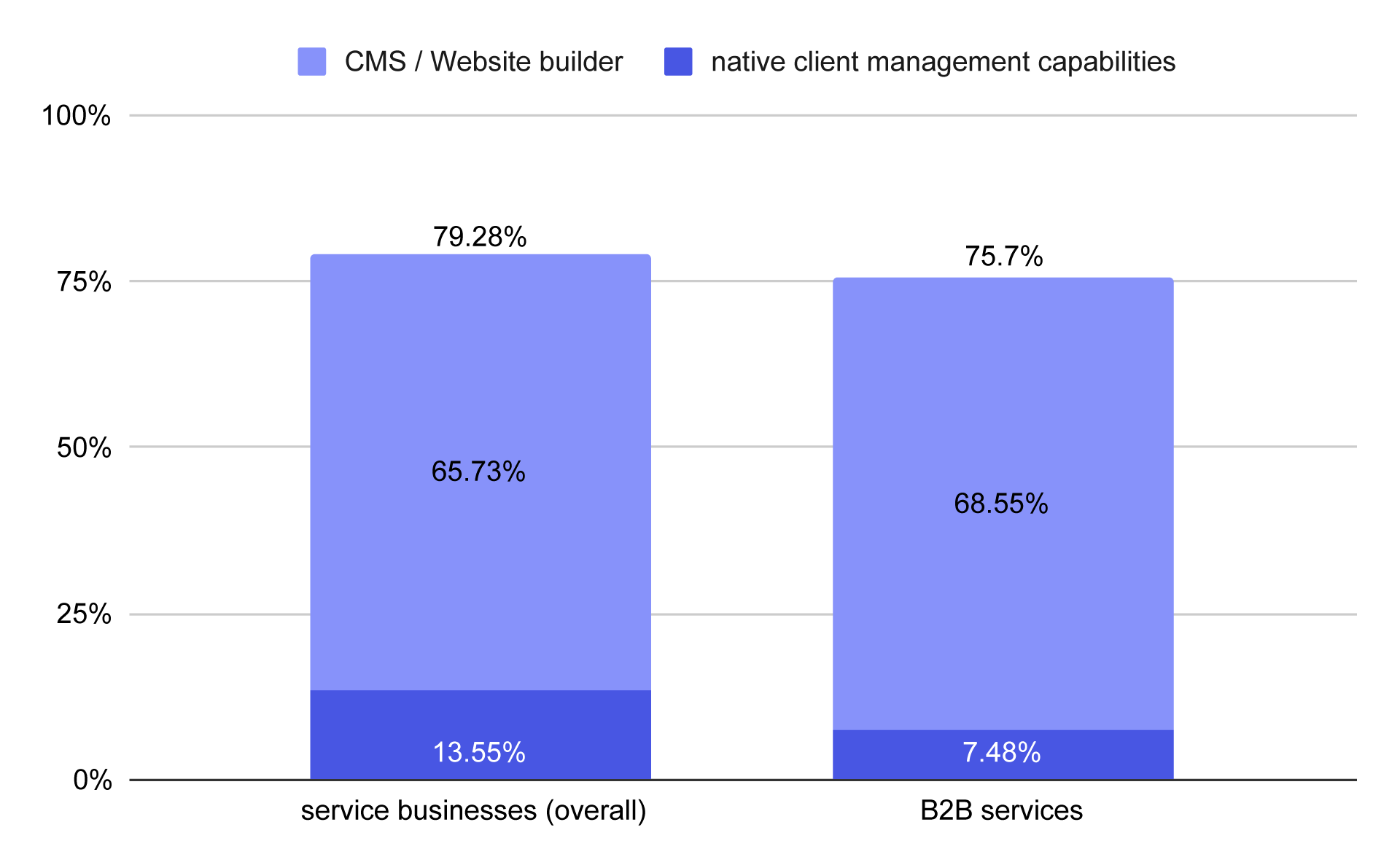 Intuition might suggest that B2B service businesses would have an even higher adoption rate, but the data shows the opposite: 75.7% of B2B websites are built on website builders or CMS, and only 7.48% of B2B businesses use solutions with native client management capabilities.