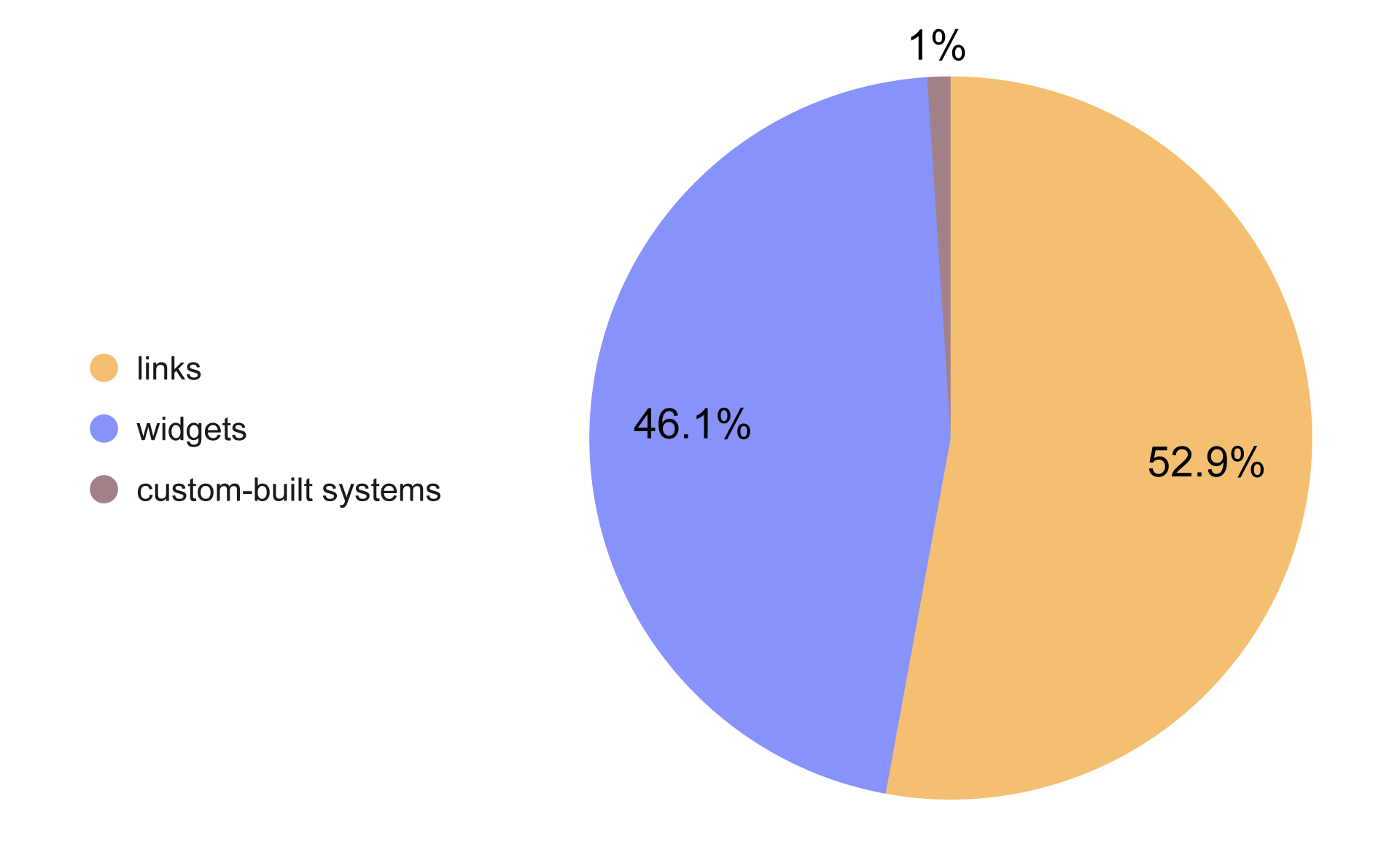 According to our data, 52.9% of booking systems were external links that redirected users off-site. Next 46.1% were embedded widgets directly on the website. And the remaining 1% were native systems — custom-built solutions, likely developed specifically for that site.